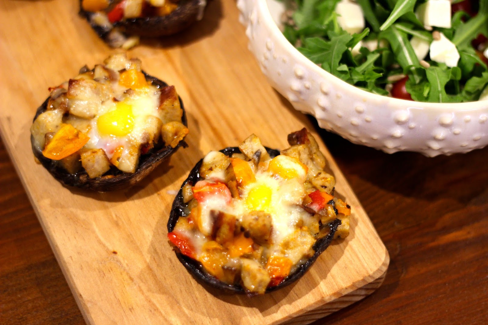 Retire os cogumelos do forno e divida a mistura pelos cogumelos. Abra um espaço ao meio dos cogumelos e coloque aí o ovo de codorniz e polvilhe depois com um pouco de queijo ralado.