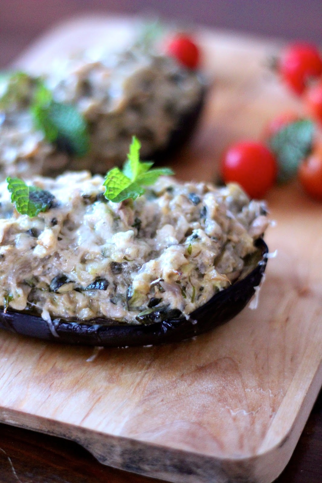 Retire as beringelas do forno e encha o seu interior com o preparado de legumes e de atum. Polvilhe com um pouco de parmesão ralado na hora e leve novamente ao forno para acabar de cozinhar e derreter e tostar o queijo.