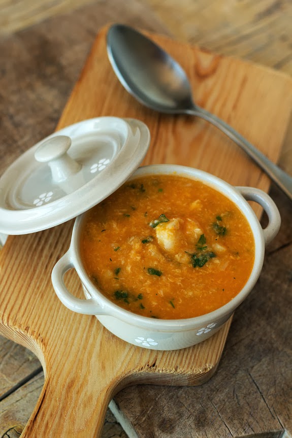 1. Cozer os rabos de pescada, depois de descongelados, em água temperada com sal. Depois de cozida, reservar o caldo de cozedura.