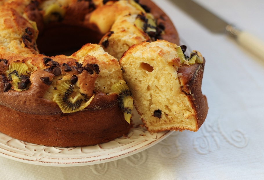 Verta para dentro da forma reservada, junte as pepitas de chocolate e disponha das rodelas de kiwi pela superfície do bolo.
