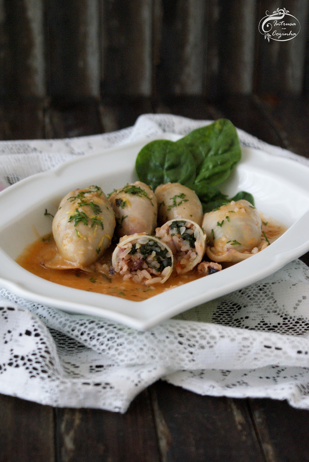 Num tacho coloque um pouco de azeite, e deixe aquecer. Junte uma das cebolas picadas, dois dentes de alho e a folha de louro. Deixe refogar até que a cebola fique translúcida. Junte um dos tomates, e deixe cozinhar mais um pouco. Junte os tentáculos, refresque com um pouquinho de vinho branco, e deixe cozer em lume brando. Quando estiverem cozidos retire a folha de louro, junte-lhes as folhas de espinafres, e envolva. Deixe cozer mais um pouco, até que os espinafres estejam tenros. Retire do lume e junte o arroz. Envolva tudo muito bem.